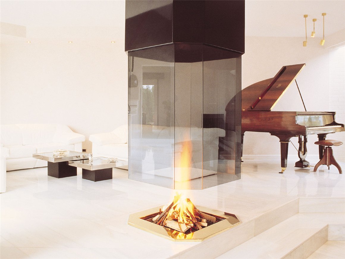 - Прямое тонированное стекло добавляет особый шик данной модели. Открытый очаг, расположенный на полу, делает модель неповторимой.