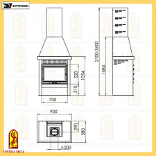 Угловой камин из Гарского камня. Плита и консоль из огнеупорного кирпича, толщиной 1,5 см. Деревянная балка Iroko. Металлическая топка 904 с колосником и зольником.