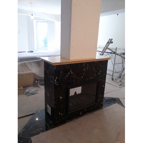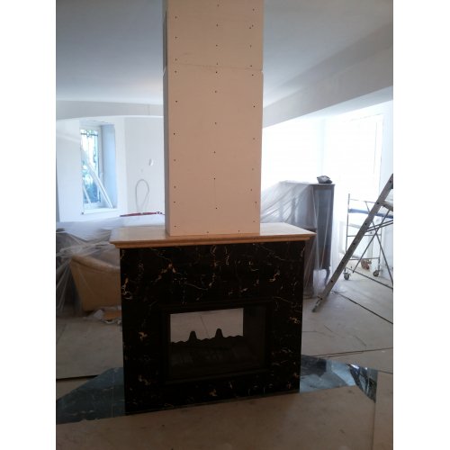 Монтаж чугунной топки Invicta 800 Double Face (2 стекла) и мраморной облицовки из мрамора.