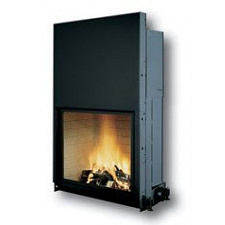 Металлическая отопительная печь-камин. Ввод наружнего/первичного воздуха. Облицовка для топки из нержавеющей стали. Вертикальная полоска-инкрустация из нержавеющей стали. Поднимающаяся и открывающаяся классическим способом дверца. Цвет RAL 8017.