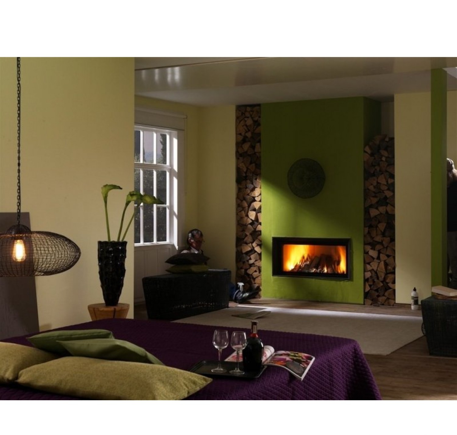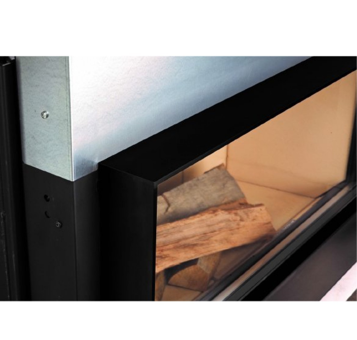 Каминная топка с прямым стеклом. Топочная камера футерована шамотом. Подъёмный механизм двери (система Easy-Lift). Ширина дверки 1010 мм. Высота дверки 458 мм. Возможно подключение воздуха извне.