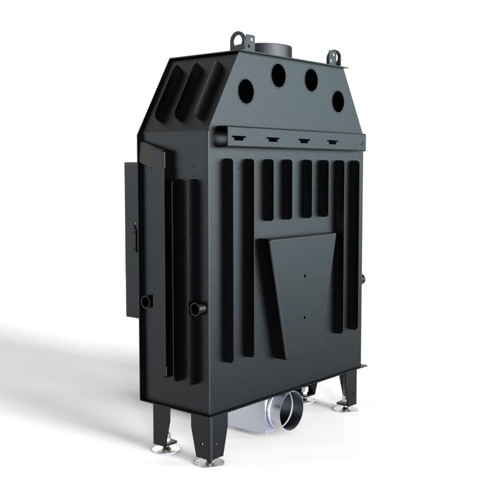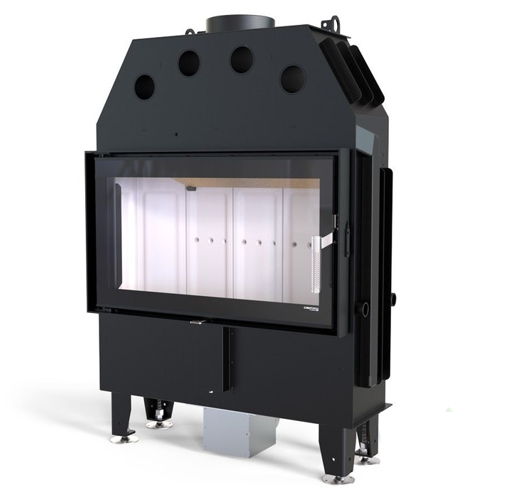 Изготовлена из стали с порошковым покрытием и имеет эффективность нагрева 80,1 %. Устройство с центральной подачей воздуха снаружи и возможностью ее регулировки. Специальная конструкция на трубе для подачи воздуха в топку, дает возможность изменить направление подачи воздуха на боковое. Плотно размещенные радиаторы способствуют передачи больше тепла окружающей среде, а воздуховоды повышают эффективность камина.